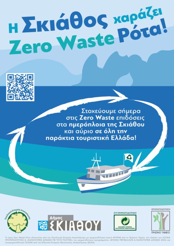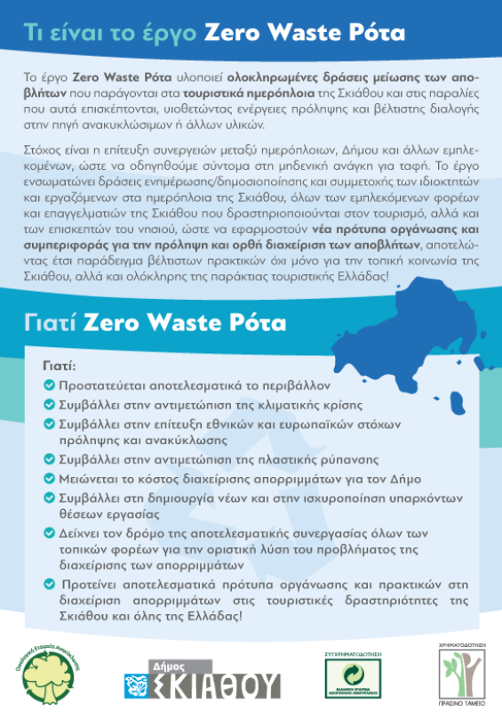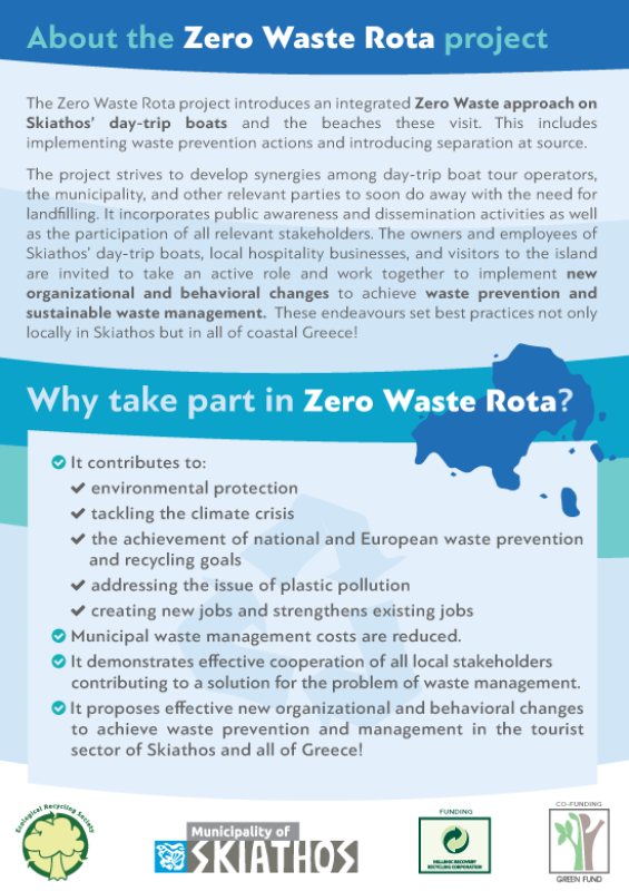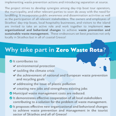 Το έργο Zero Waste Ρότα υλοποιεί ολοκληρωμένες δράσεις μείωσης των αποβλήτων που παράγονται στα τουριστικά ημερόπλοια της Σκιάθου και στις παραλίες που αυτά επισκέπτονται, υιοθετώντας ενέργειες πρόληψης και βέλτιστης διαλογής στην πηγή ανακυκλώσιμων ή άλλων υλικών.