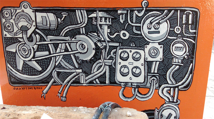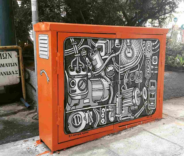 Η φύση του ΚΑΦΑΟ είναι να φιλοξενεί διακλαδωτές, καλώδια, ηλεκτροβιομηχανικό εξοπλισμό. Η ιδέα της απόρριψης αυτής της ιδιότητας δε μου είναι ιδιαίτερα ελκυστική, θεωρώ ότι μπορεί να αποτελέσει μια υποκριτική αλλοίωση ενός στοιχείου της πόλης. Δεν βλέπω τον λόγο της απόκρυψης της φύσης του αντικειμένου. Αντίθετα, με ενδιαφέρει η σουρεαλιστική του παραμόρφωση αξιοποιώντας συμβολικά τα σωθικά του ΚΑΦΑΟ ως εργαλεία. Με ενδιαφέρει η αλλοίωση όχι της πρωτογενούς φύσης, αλλά της μορφής – εκεί αποτυπώνεται το μη πραγματικό με την μείξη ηλεκτρομηχανολογικών εξαρτημάτων σχετικών και άσχετων με το ΚΑΦΑΟ σε μια χαοτική διάταξη, αλλά και με τη χρήση περιγραμμάτων και γραμμοσκιάσεων, όπως σε ένα doodle που θα έκανε κανείς μιλώντας στο τηλέφωνο.