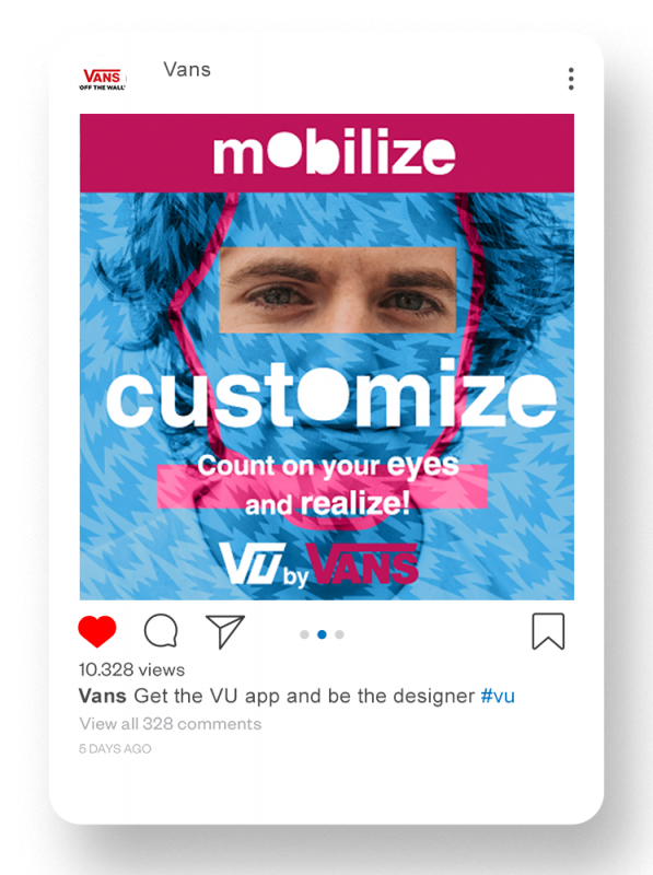 The eyes are the centre of a composition where portraits of young people of all genders and ethnicities are shown; their face is diffused into recognizable patterns typical of the brand, but yet totally customized with colours, and filtered through expressive portraits of everyday people.